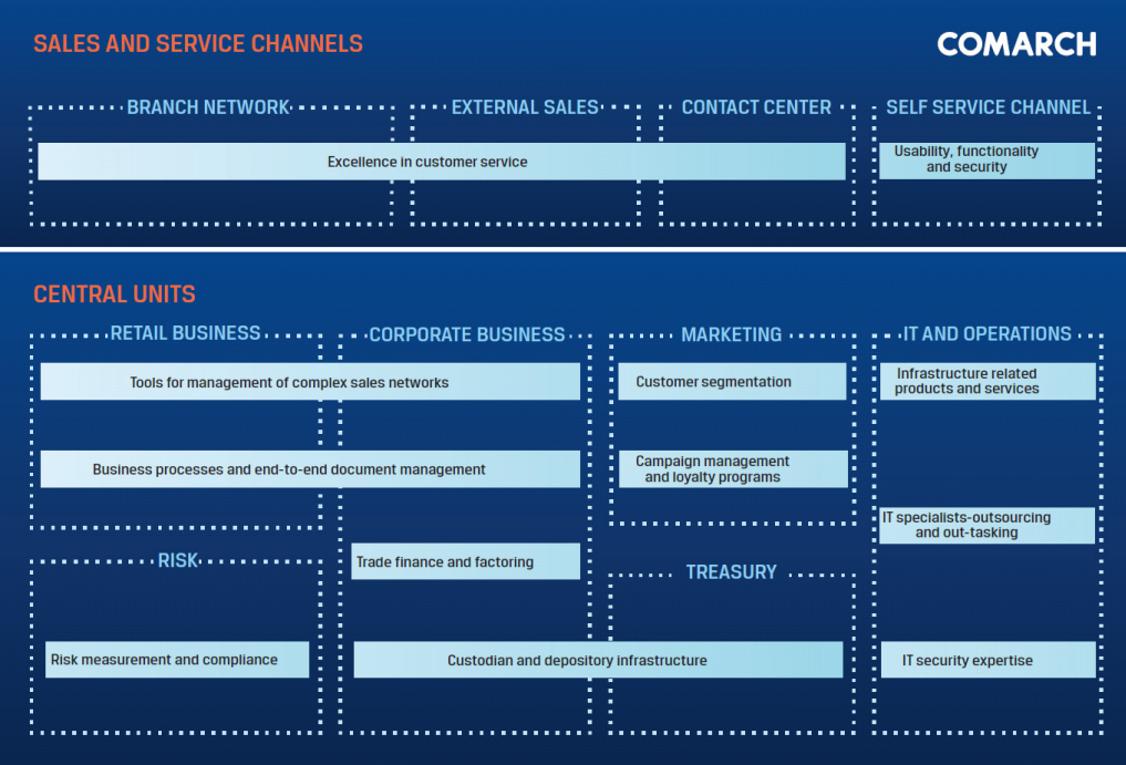 Comarch has been delivering systems to various financial institutions, such as banks, brokerage houses, insurers and companies which manage assets and funds, for more than 15 years. As one of the largest IT suppliers in Poland and East-Central Europe, Comarch boasts many product lines, a rich collection of competencies and most importantly a large group of satisfied clients. We offer our own pre-designed solutions, dedicated solutions and work based on integrating systems.